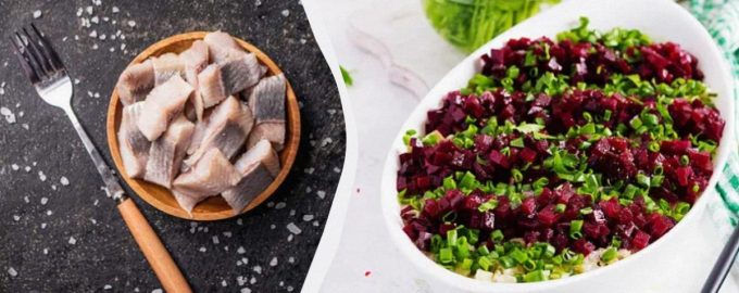 Amellett, hogy ez egy nagyon finom saláta heringgel és céklával, a lehető legegyszerűbben van elkészítve, ami szintén bónuszokat ad hozzá. A heringet filére kell bontani, vagy vásárolhatunk kész konzerveket. Minden darabot vékonyan felszeletelünk, mint a „Shuba” esetében, tálba tesszük. Ezután vegyünk főtt céklát, hámozzuk meg, vágjuk közepes méretű kockákra. Ugyanezt tegye meg a főtt tojással. Külön vágja fel a zöldhagymát.