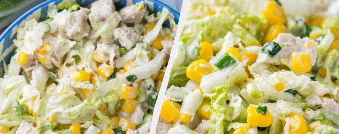 Könnyen gyomorbarát saláta káposztával, csirkével és kukoricával, könnyen elkészíthető.